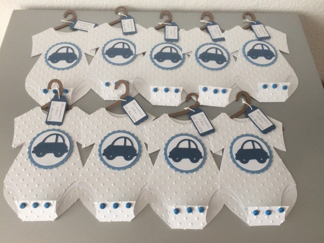 Als Einladung gefallen mir super gut diese Baby Bodys mit dem Auto oder dem Elefant.