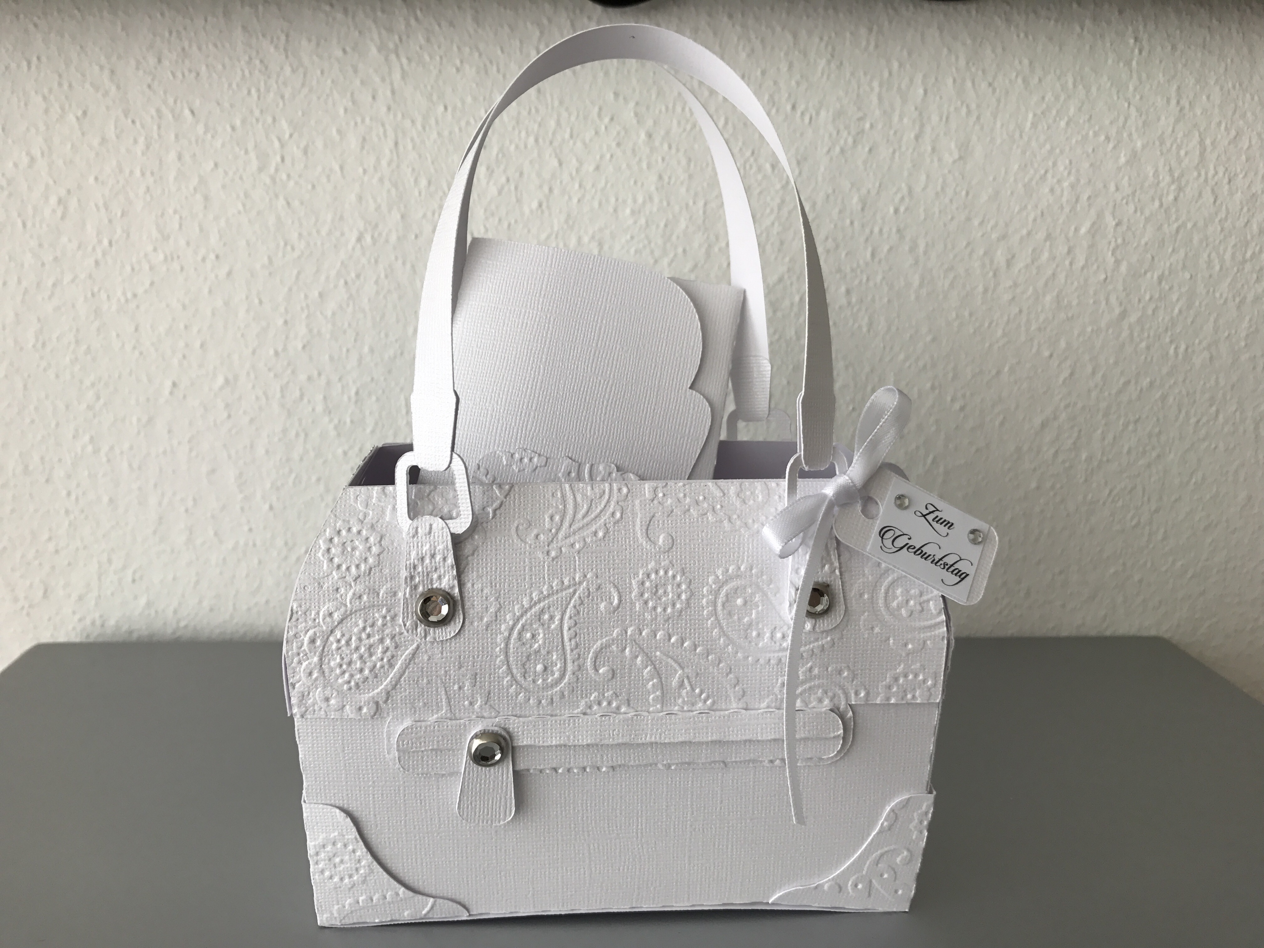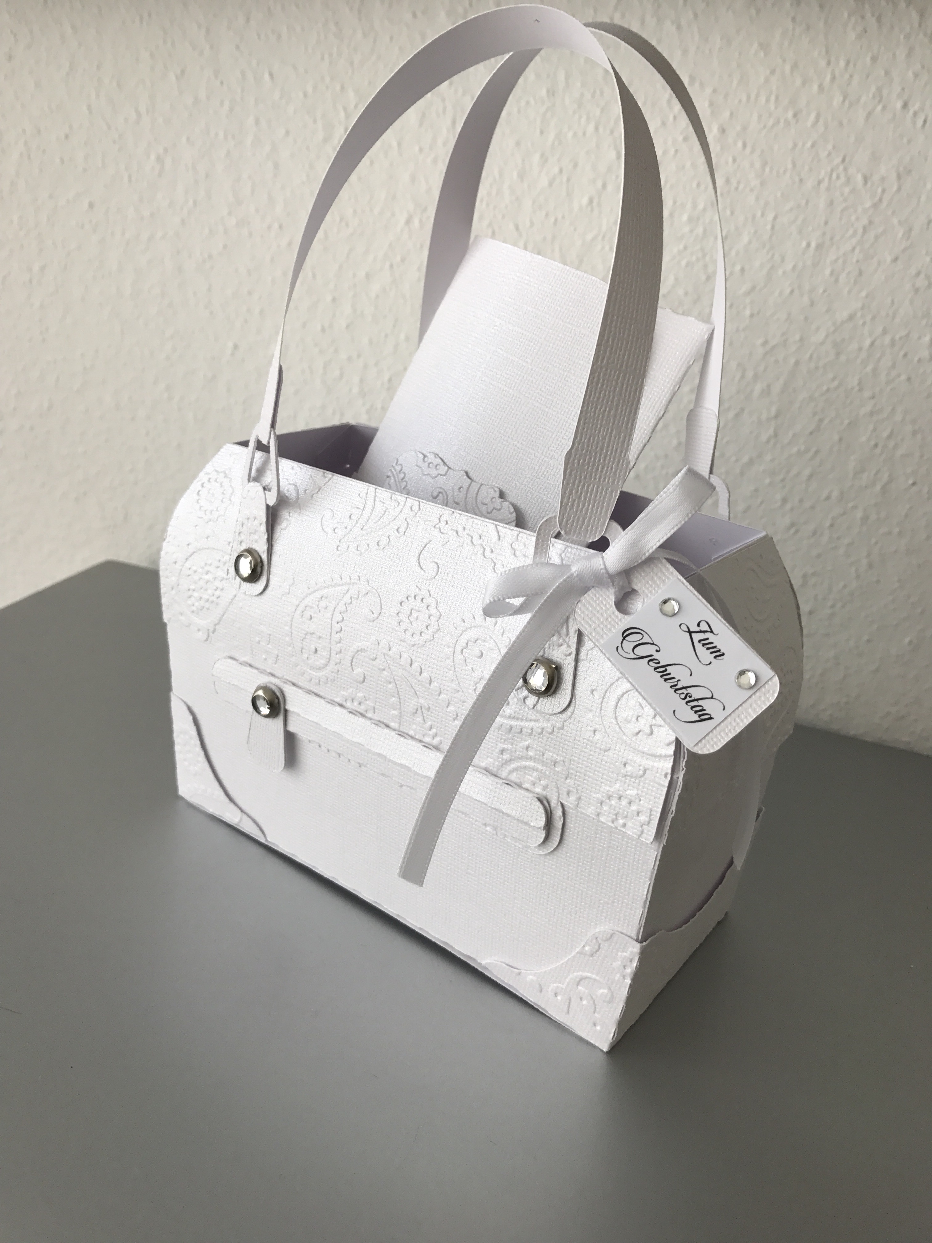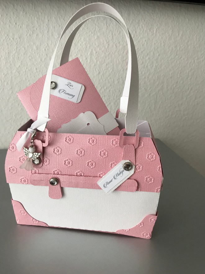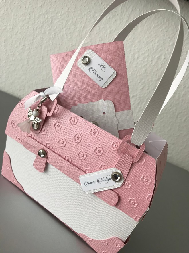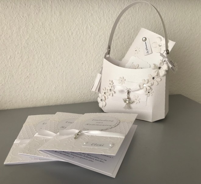 Pop up Karte mit Taube innen als Einladung zur Kommunion – ganz in Weiß! Als Geschenk fürs Kommunionskind die passende Tasche als Geldgeschenk.