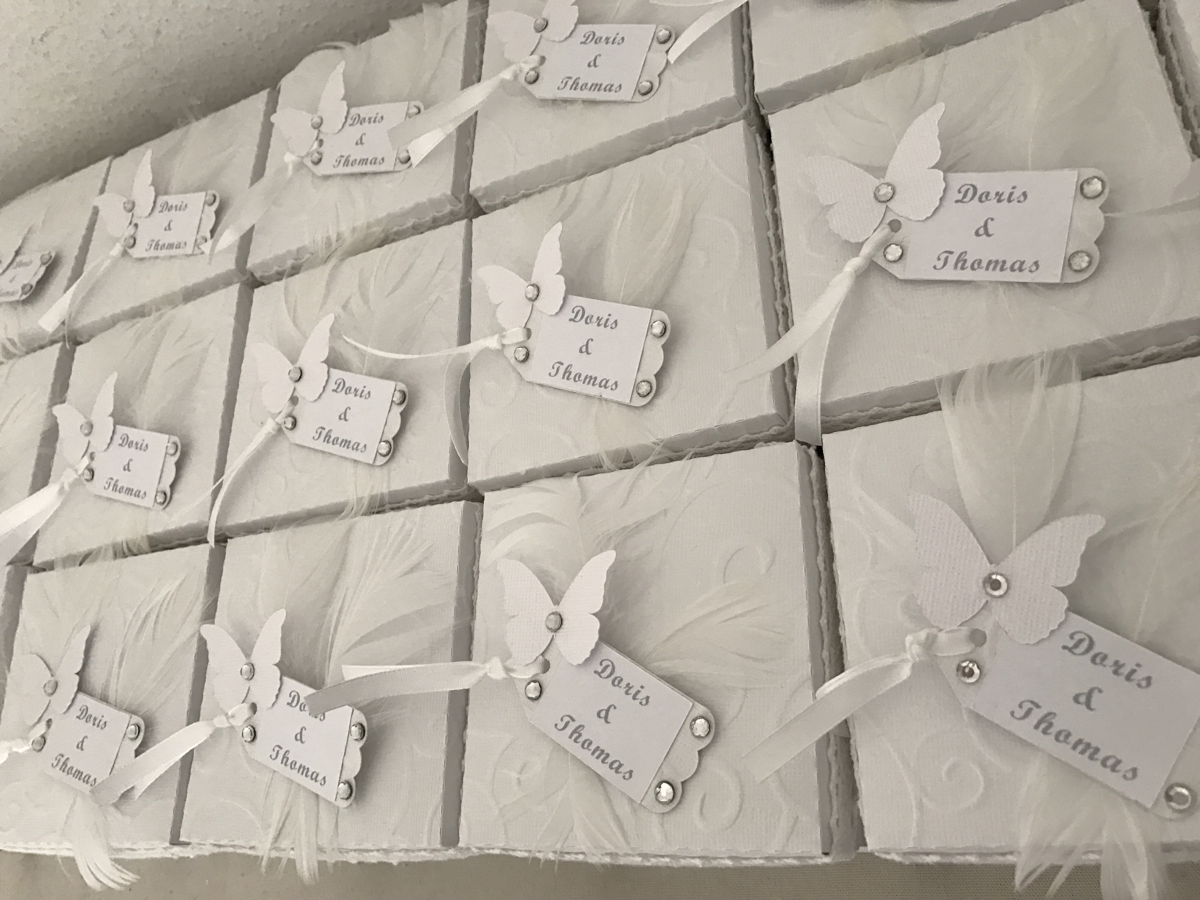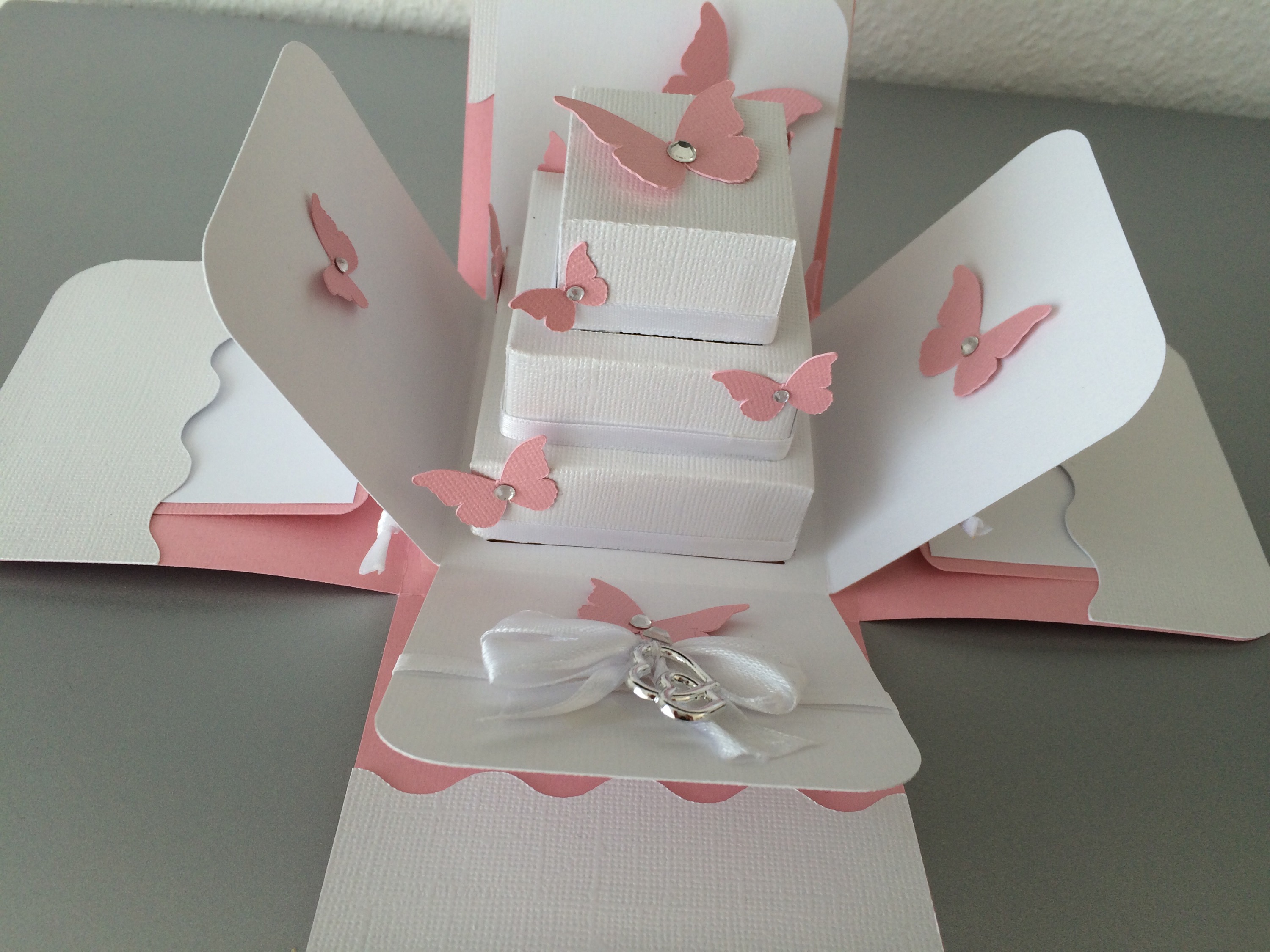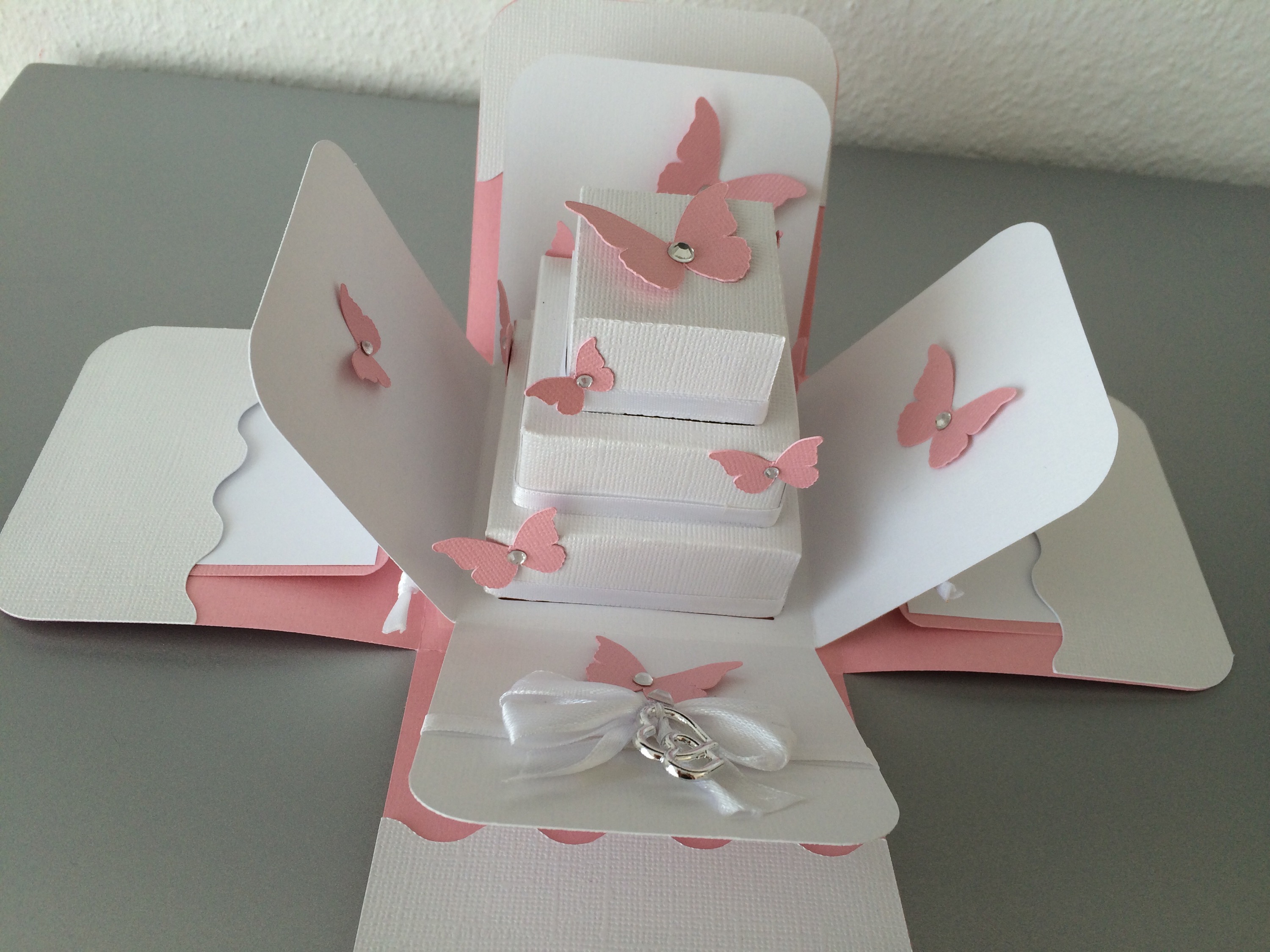 Was am Anfang noch wie eine normale Box aussieht sorgt beim öffnen für eine Überraschung. Hochzeitstorte mit Schmetterlingen – seitlich Fächer für Geld und zwei weitere Fächer mit Kärtchen für Glückwünsche.